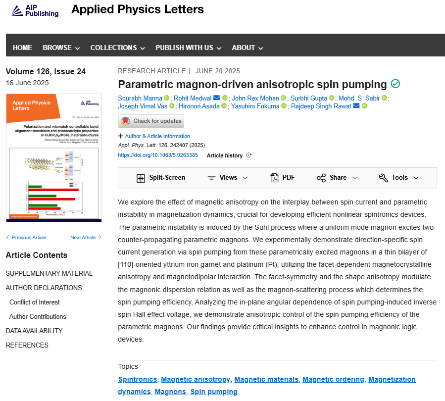 Paper Publication Applied Physics Letters誌に「Parametric magnon-driven anisotropic spin pumping」が掲載されました。