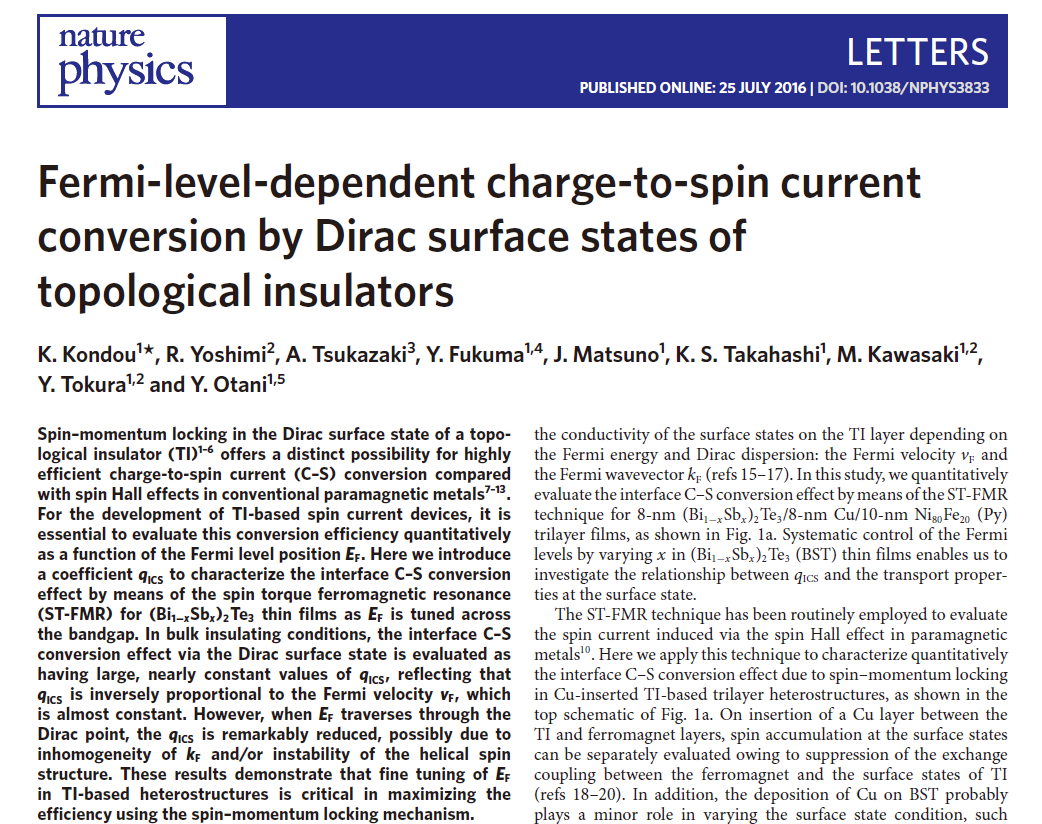 Nature Physics誌に、トポロジカル絶縁体でのスピン流・電流変換に関する論文「Fermi-level-dependent charge-to-spin current conversion by Dirac surface states of topological insulators」が掲載されました。
