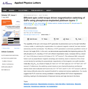 Applied Physics Letters誌に「Efficient spin–orbit torque driven magnetization switching of GdFe using phosphorus-implanted platinum layers」が掲載されました。